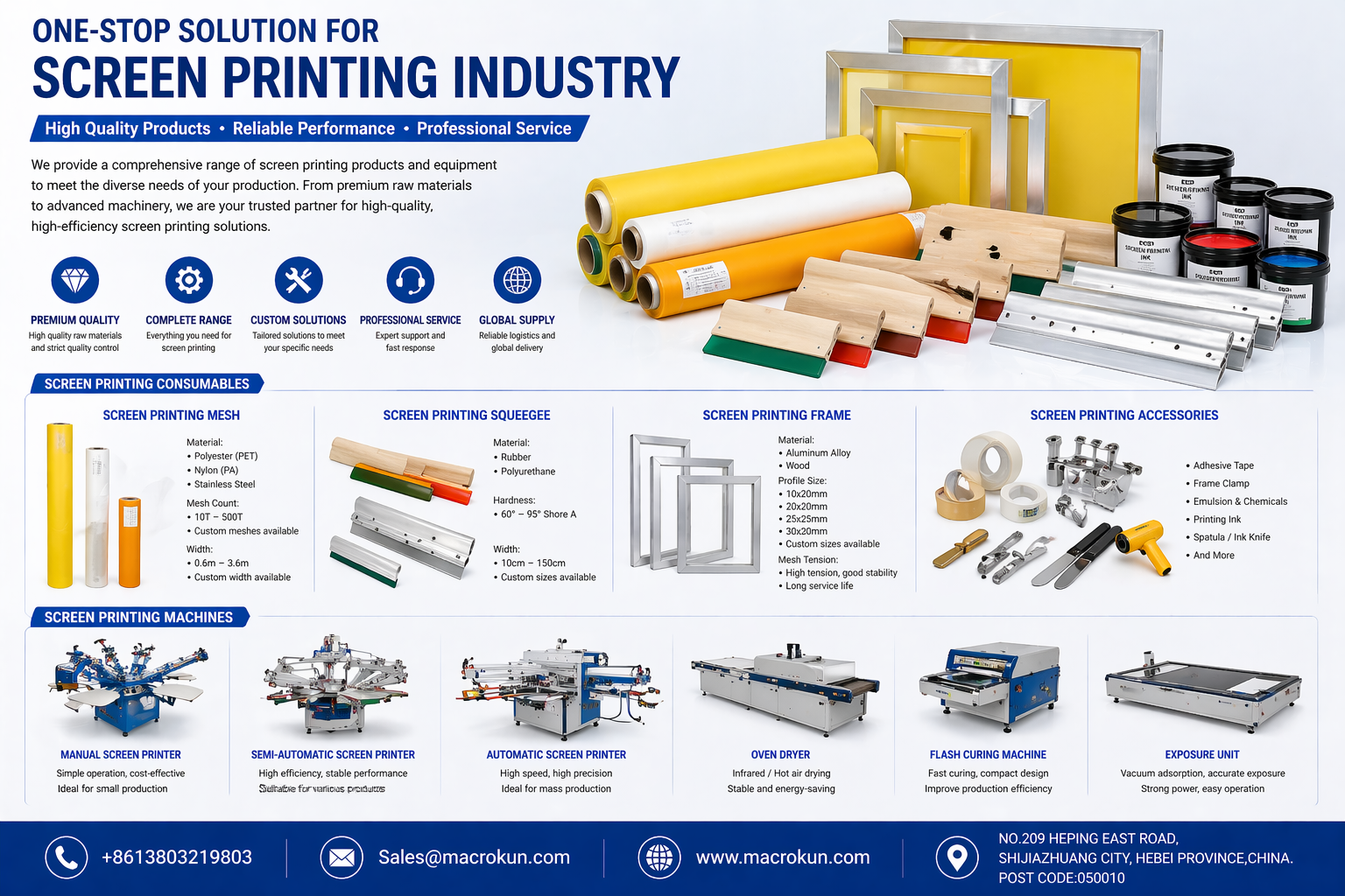 Macrokun company to provide you with best screen printing frames,screen printing mesh,screen printing scrapers and other high-quality silk screen printing supplies. We are the best supplier of wholesale sales of screen printing material supplies in China.Whatever screen printing supplies you need, we are in stock and ready to ship. Find the right person for you.